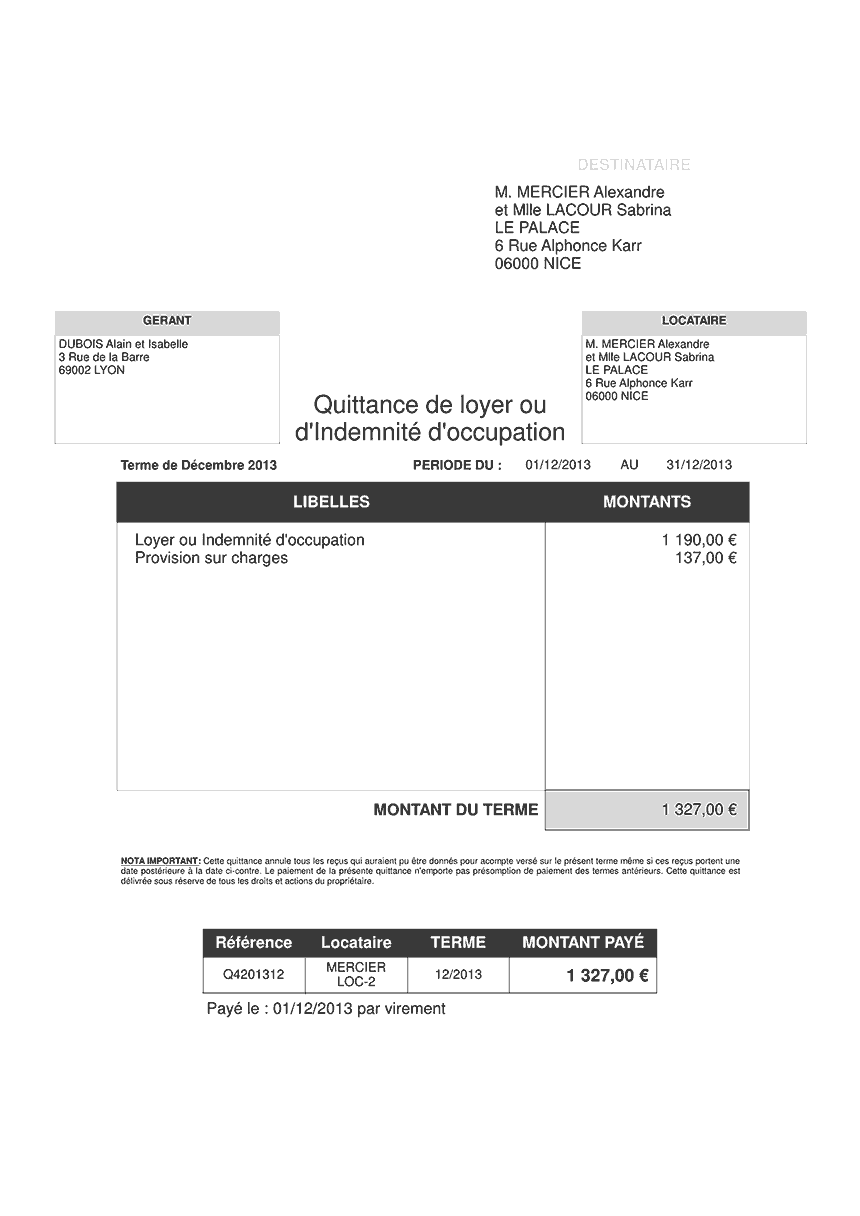 Ce document permettra au locataire d'attester qu'il paye régulièrement son loyer.