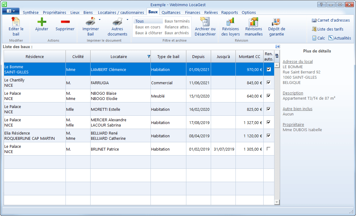 Cette rubrique est l'une des plus importantes, car elle permet la gestion de vos baux.